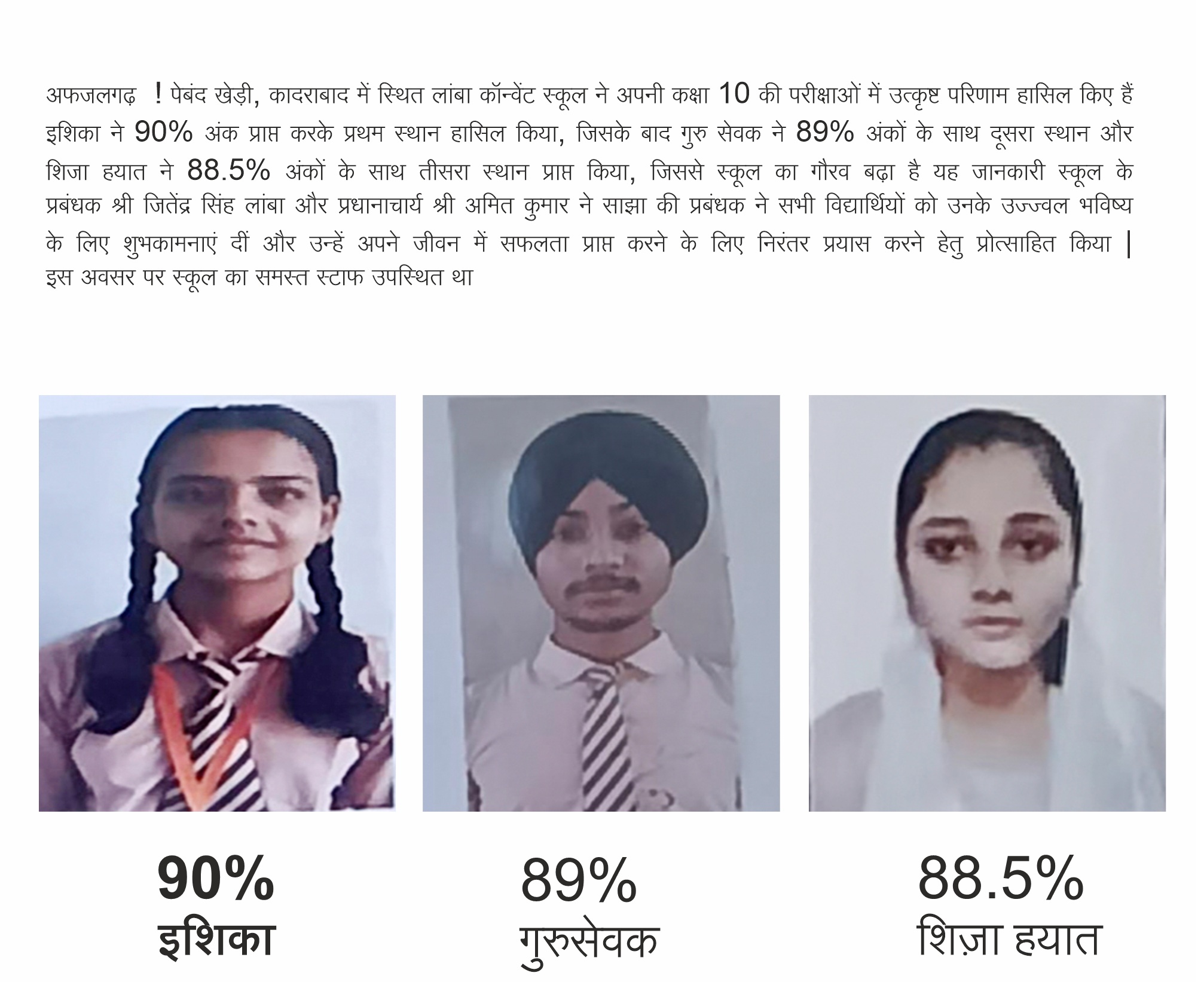 The school founded in the year 2009 and the foundation stone laid by Smt. Raj Dulari, Sh. Ajeet Singh and Sh Sansar Singh The school is governed by Lamba Convent and Social welfare society Pebandkheri(U.P).